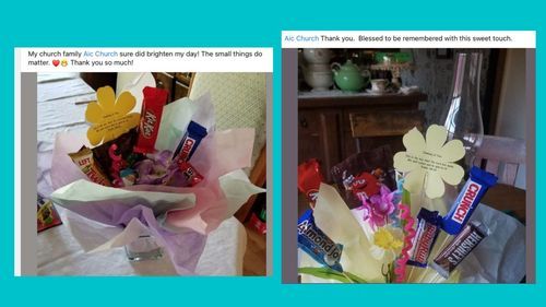 Once the bouquets were assembled another 20 volunteers picked up and delivered 45 of the bouquets to members and regular attendees of Alive In Christ that we hoped would find encouragement from them. Some bouquets were just dropped at doors with texts or phone calls to let the recipient know they had a surprise. Most of the bouquets were delivered to the person and some socializing was done. The prayer was that both the deliverer and recipient would be equally blessed by the gesture. Below are a couple of the responses we received through Facebook to the bouquets.