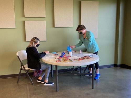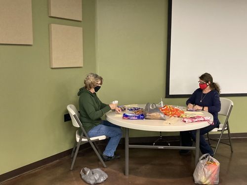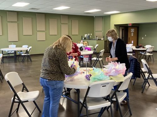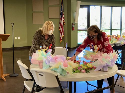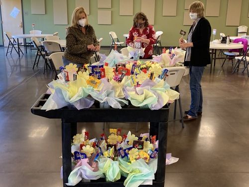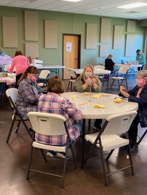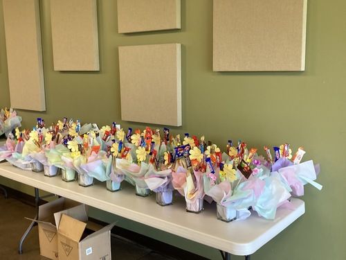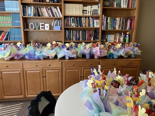 Almost 20 women came together at Alive In Christ over 2 mornings to craft and spread a little joy. The team assembled 120 candy/flower bouquets. Some of the ladies worked magic with hot glue guns while others showed off their attention to detail as they made arrangements. You can see them hard at work in many of the pictures below.